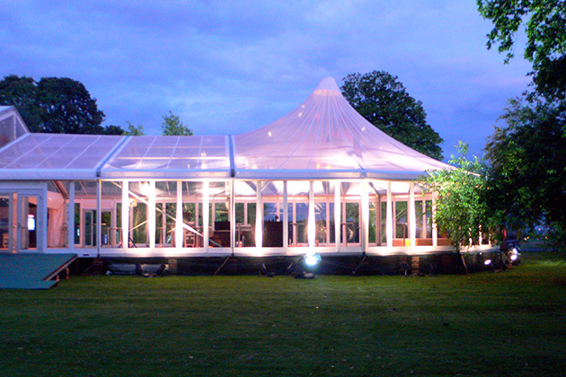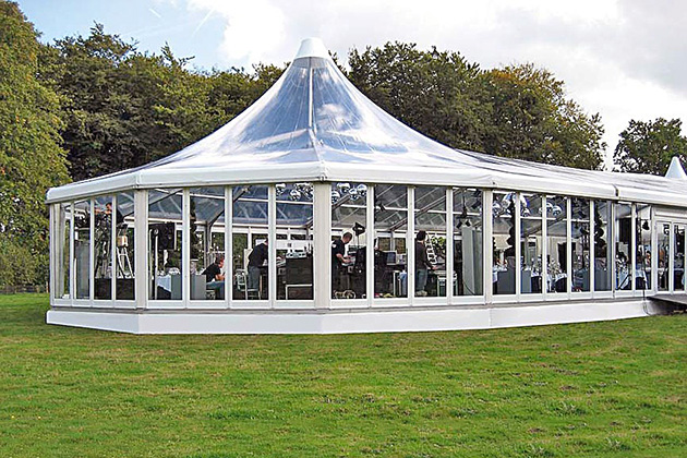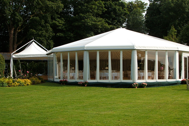 Coopers Marquees’ Marquee roofs are made of polyester coated PVC. These are contained within a patented tensioning system which prevents any noisy flapping of the roof covers. The roof of any Marquee that Coopers Marquees provides overhangs the sidewalls and uses a unique guttering system which feeds into downpipes, thereby avoiding rain blowing off the eaves and back onto the marquee. Ventilation in all of our Marquees is controlled in the roof space by an adjustable grid at either end of each structure, eliminating the risk of stale air and condensation